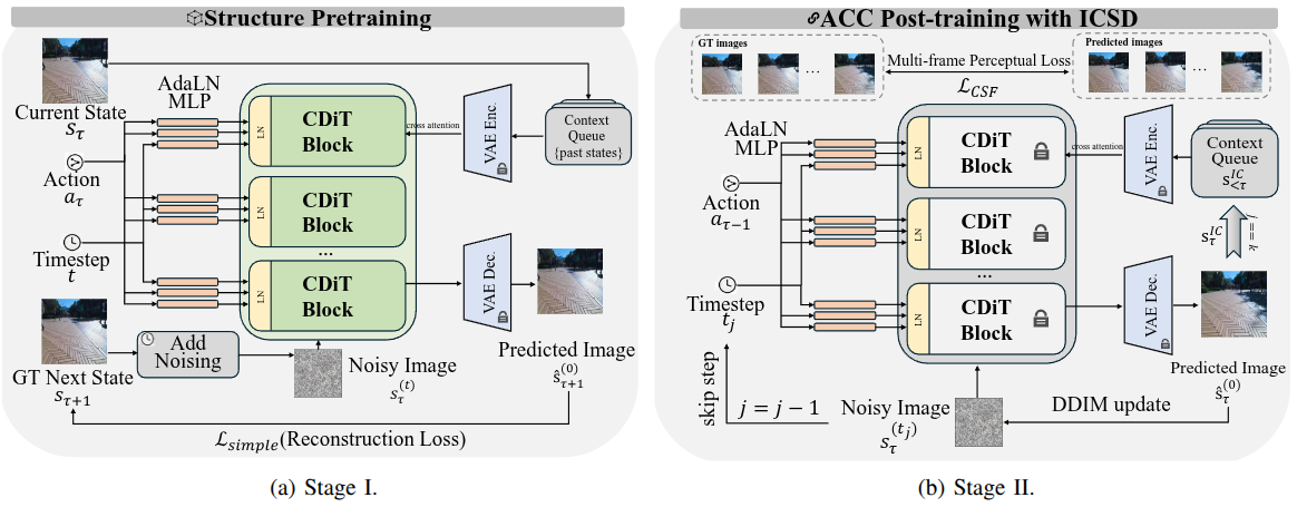 Overview of the Two-stage training pipeline for MWM. Our training paradigm first performs structure pretraining to learn fine-grained geometry and illumination-dependent appearance, then applies ACC post-training to mitigate compounding error while freezing the CDiT backbone and updating only AdaLN. Within post-training, we introduce ICSD to enable distillation that preserves the consistency objective, while aligning truncated training-time estimates with the inference-time endpoint.
