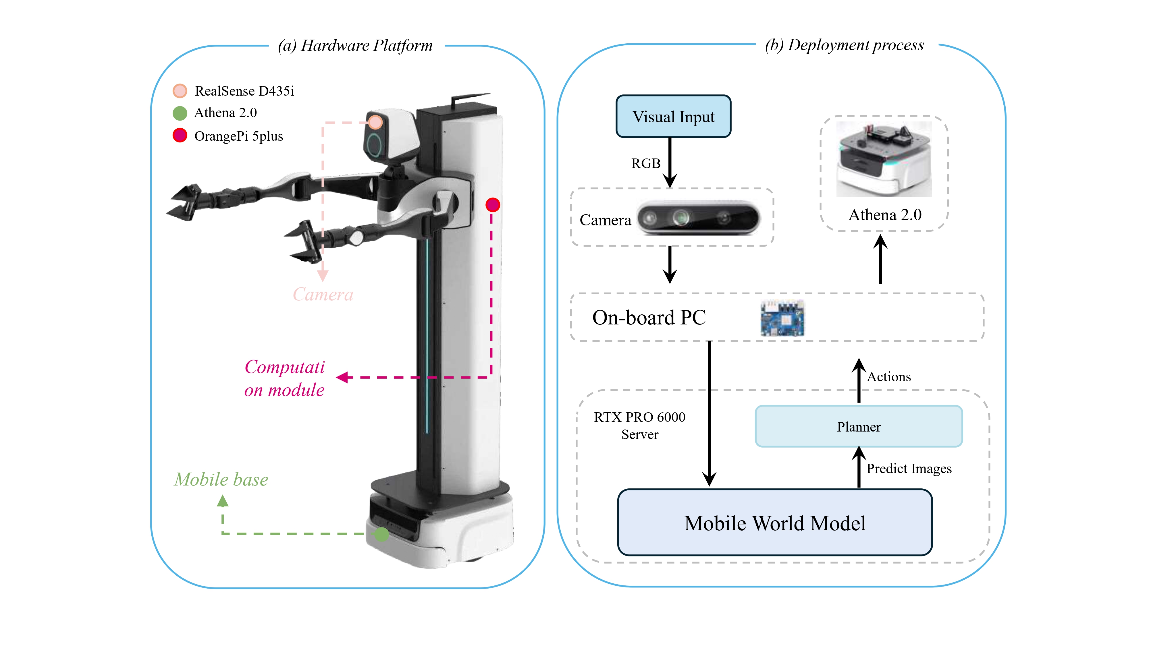 Real-world deployment setup on the AIRBOT Mobile Manipulation Kit 2 (MMK2). (a) Hardware platform. (b) Deployment process.